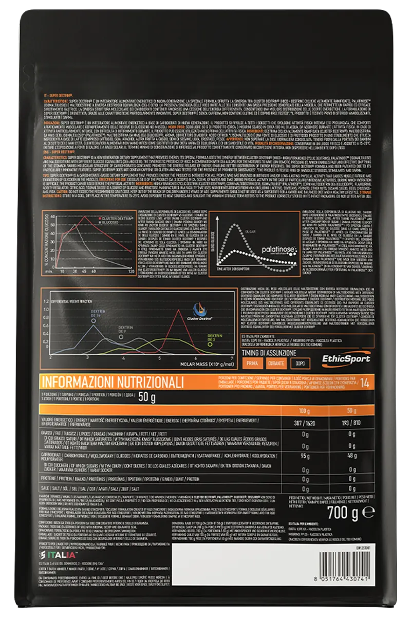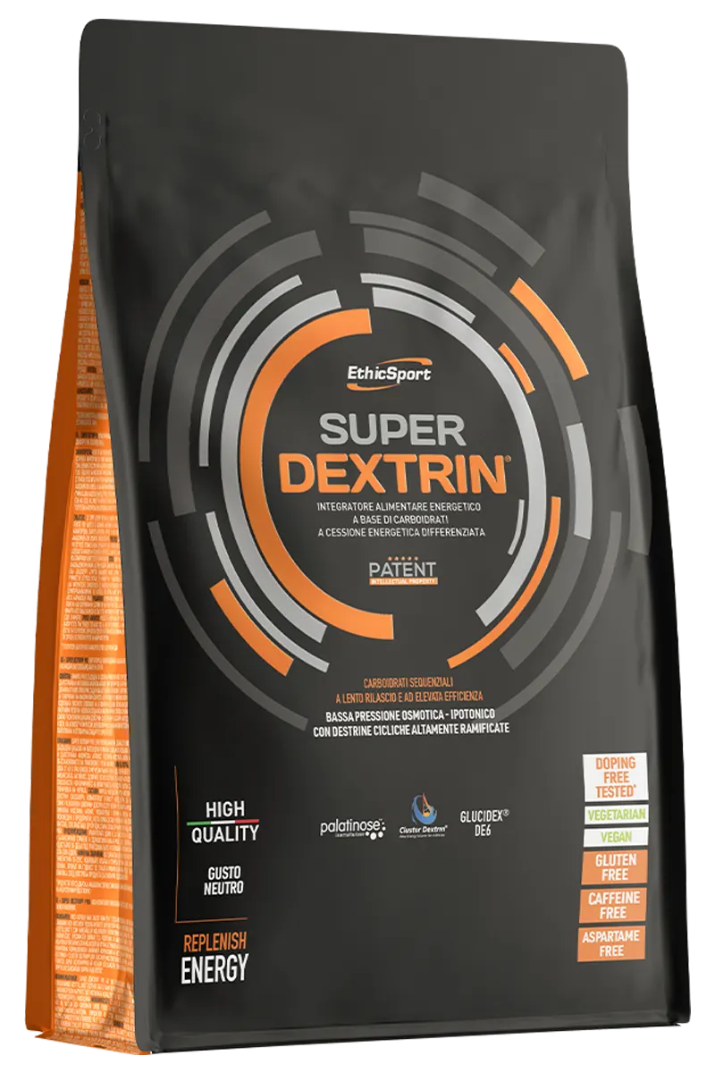 SUPER DEXTRIN® er et energitilskudd av ny generasjon. Den spesielle formelen utnytter synergien mellom Cluster Dextrin® (sterkt forgrenede sykliske dekstriner), Palatinose™ (isomaltulose) og maltodekstriner med forskjellige dekstroseekvivalenter (DE6 og DE18). Kombinasjonen av HBCD og DE6 gir blandingen en lav osmolaritet, noe som gir utmerket toleranse selv under fysisk anstrengelse. De forskjellige molekylære strukturene i karbohydratene fremmer en differensiert energifrigjøring, som støtter optimal håndtering av energilagre over tid.