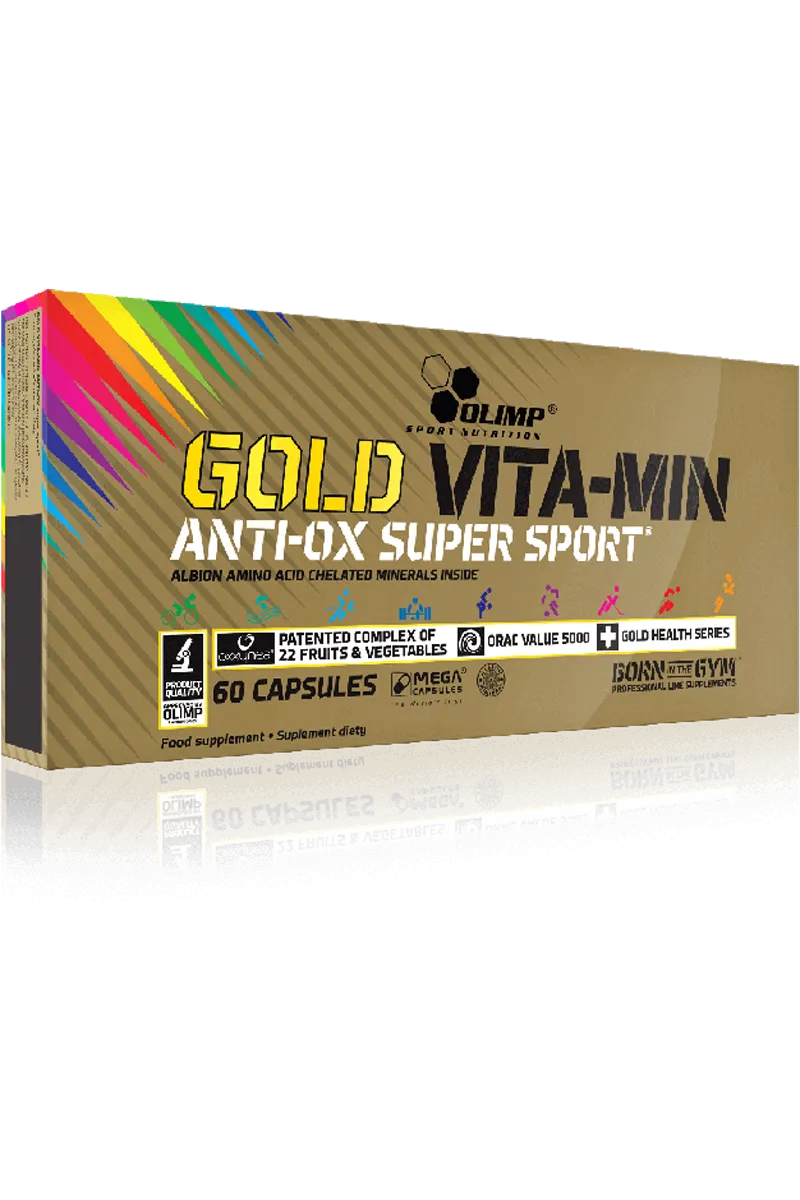 GOLD VITA-MIN ANTI-OX super sportÂź 2-komponents kosttilskudd i kapsler, med vitaminer og mineralkomponenter, beriket med megadoser av antioksidanter. Kompleks sammensetning av mineralkomponenter i form av aminosyrekelater og vitamin VITA-MIN POWER-kompleks og urteekstrakter med naturlige antioksidanter som bidrar til Ă„ nĂžytralisere negative effekter av oksidasjon ANTI-OX POWER-blandingen. Produktet er utviklet for fysisk aktive, spesielt idrettsutĂžvere. OXXYNEAÂź – en patentert blanding bestĂ„ende av 22 ekstrakter fra grĂžnnsaker og frukt, utvalgt for Ă„ oppnĂ„ den hĂžyeste antioksidantkapasiteten pĂ„ 5000 ORAC.