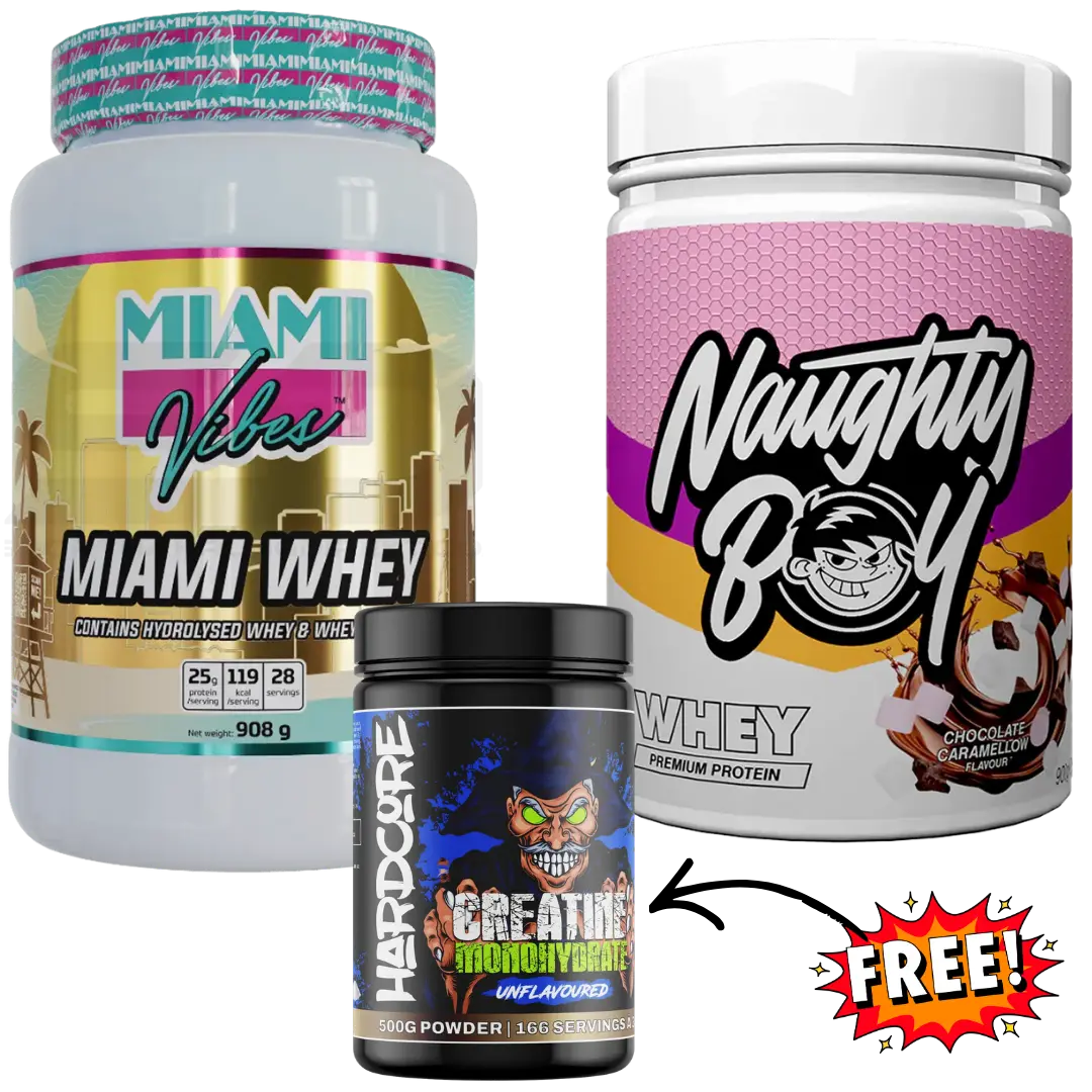 Sikre deg et utvalg av premium proteinpulver fra høykvalitets-merkevarer som Naughty Boy og Per4m og Miami Vibes! Velg fritt blant smaker og få ekstra rabatt på denne pakken i tillegg til gratis kreatin.