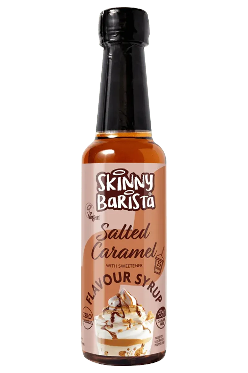 Saltet karamell-kaffesirup, sukkerfri, 250 ml. Smaken du elsker, nå i en praktisk 250 ml størrelse! Vår Skinny Barista Salted Caramel Syrup er den samme uimotståelige bestselgeren fra 1-litersversjonen, laget for å gi den perfekte balansen mellom søtt og salt til favorittdrinkene dine. Enten du løfter morgenkaffen eller lager deilige latte, gir denne kalorifattige sirupen en rik smak uten kompromisser. Denne deilige saltkaramellsirupen er det perfekte tilskuddet til søte festlige bakverk og drinker, eller til og med til din favoritt morgenkaffe. Saltkaramellsmaken gir en rik og nøtteaktig dybde til dine favorittkaffeblandinger, og best av alt er den helt sukkerfri og veganvennlig.