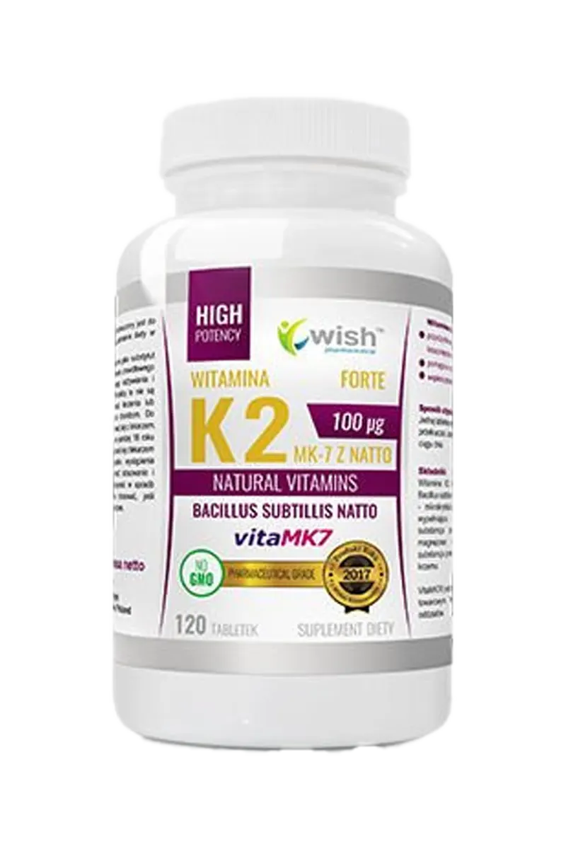WISH Phamraceutical Vitamin K2 MK-7 Natto er et kosttilskudd som inneholder en hÞy konsentrasjon av aktive ingredienser. Basen er vitamin K2. Produktet er produsert gjennom naturlige biofermenteringsprosesser av natto-bakterier (Bacillus subtilis). Disse bakteriene brukes ofte i, blant annet, den tradisjonelle japanske retten natto. Den unike formelen til vitamin K2 MK-7 Natto- tilskuddet inneholder naturlig vitamin K2, som er kombinert med den svÊrt absorberbare MK-7 fra natto. De aktive ingrediensene nÄr raskt blodet, noe som sikrer at de absorberes perfekt og er klare til Ä virke.